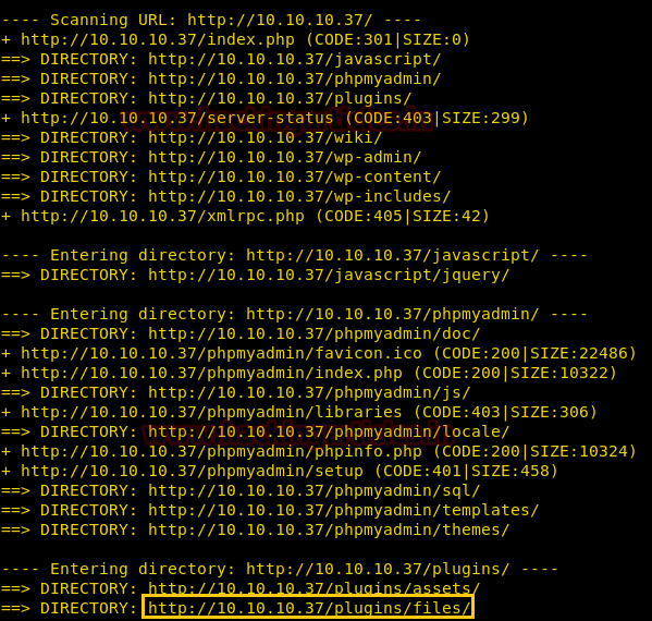Next, we use the dirb tool of kali to enumerate the directories and found some important directories such as /phpmyadmin, /wp-admin, /plugin/files and etc which you can confirm from below image.