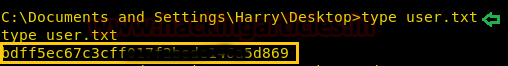 meterpreter > shellInside C:\Document and Setting\Harry\Desktop I found the user.txt file and used the type “filename” command for reading this file.