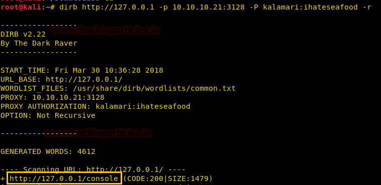 dirb http://127.0.0.1 -p 10.10.10.21:3128 -P kalamari:ihateseafood -r