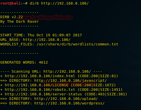 As you can see in the above image that using dirb we found various files and directories such as robots.txt, upload, etc. but you can also see that our target web application is using WordPress, so, we can easily apply a WordPress scan using the following command which covers themes, plugins, and users: