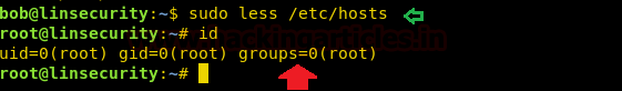 As we know it opens the file in vi mode and since you have run the command with sudo right which means we can get a shell through it. Execute !bash command inside hosts file as shown above and you will get the root shell.